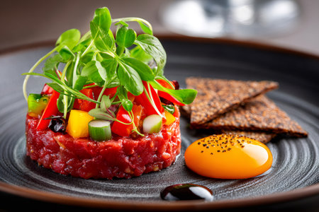 Gourmet beef tartare with raw egg yolk and herb on plate luxury appetizer with capers onions seasoned minced beef