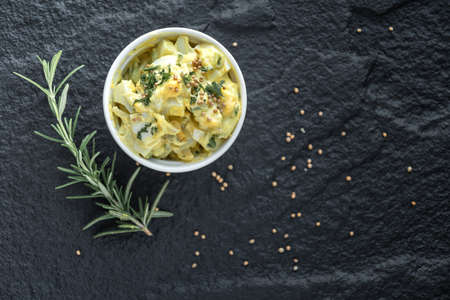 hard boiled eggs and mustard salad on black background.
