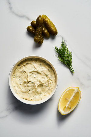 Classic Tartar Sauce ingredients on white marble background. Mayonnaise with dill and pickled cucumbers with lemon. Top view food photo. Flatlay
