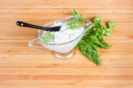 Mayonnaise sauce with garlic and chopped dill and parsley in glass gravy boat with black ceramic spoon and fresh dill and parsley separately on a wooden bamboo surface