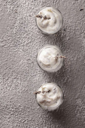 Yogurt in a glass. Lavender yogurt with Chia seeds.