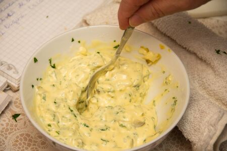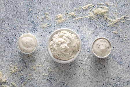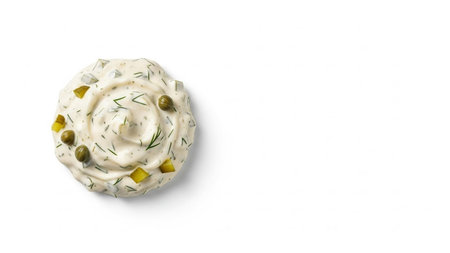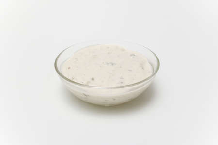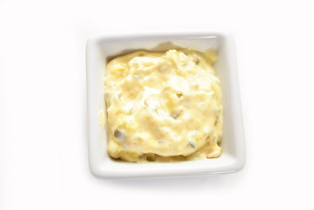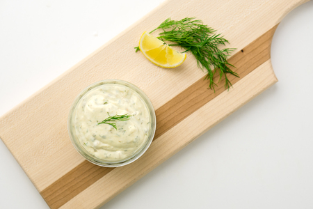 Homemade tartar sauce on white background. Made of fresh mayonnaise, lemon and various herbs. This classic creamy sauce is delicious with deep fried fish, seafood and many other dishes.