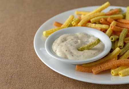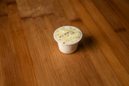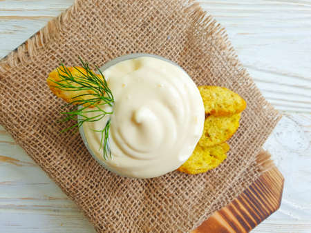 Garlic Mayo Dip sauce served in dish isolated on wooden table top view of indian food