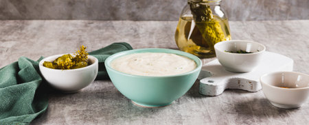 Thousand Island Dressing with ingredients close-up on the table. Horizontal view from above