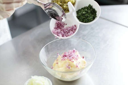 A visually appealing arrangement of fresh herbs, capers, onions, and creamy sauce, perfect for enhancing gourmet dishes and culinary creations.