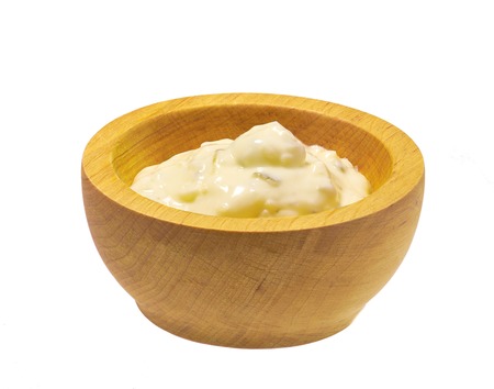 Wooden bowl of sour cream sauce with herbs isolated on white background
