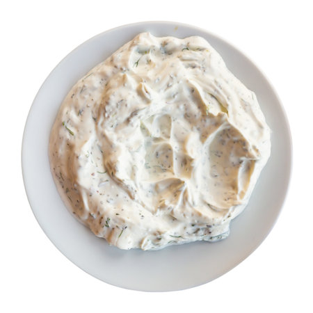 Tzatziki with olives and dill isolated on white background