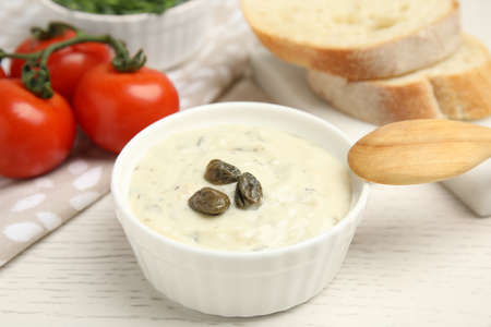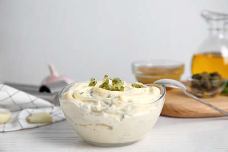 Tasty tartar sauce on white wooden table
