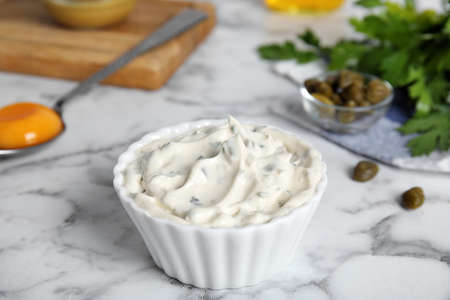Tasty tartar sauce and ingredients on white marble table