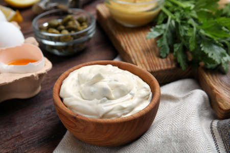Tasty tartar sauce and ingredients on wooden table