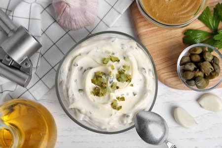 Tasty tartar sauce and ingredients on white wooden table, flat lay