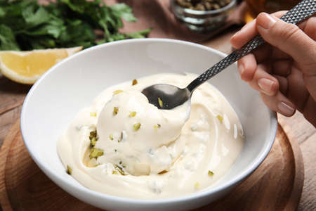 Woman making delicious tartar sauce at wooden table, closeup