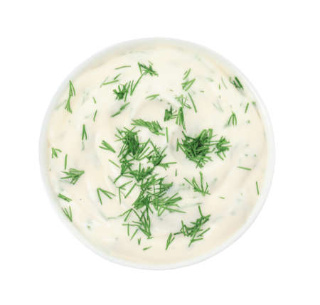 Tasty creamy dill sauce in bowl isolated on white, top view