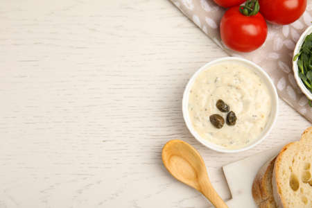 Creamy caper sauce in bowl on white wooden table, flat lay. Space for text