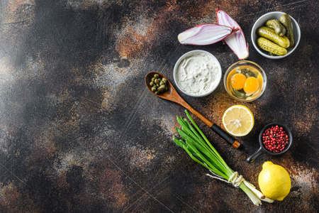 Homemade white sauce tartar tartare with ingredients pickles, capers, dill, parsley, garlic, lemon and greens top view on old rustic dark metal surface with space for text.