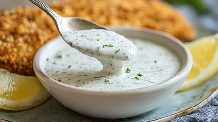 A delicious creamy herb sauce made with fresh parsley, perfect for enhancing crispy fried fish. Accompanied by lemon slices for a bright touch.
