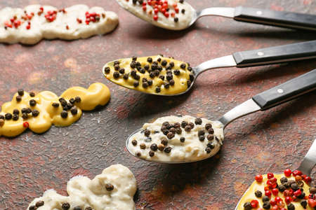 Spoons with different sauces and peppercorns on grunge background, closeup
