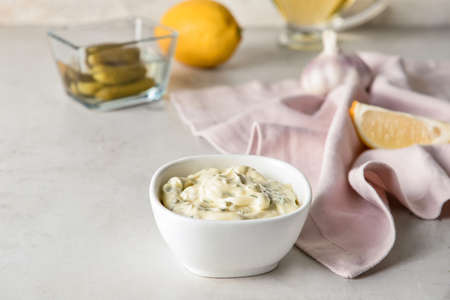 Bowl with tasty tartare sauce on light , closeup