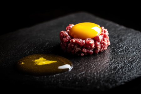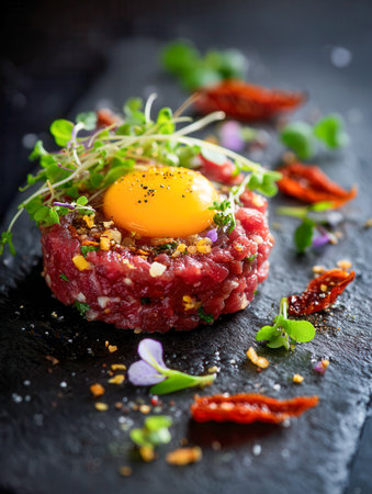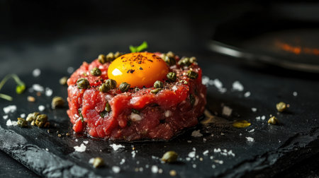Gourmet presentation of beef tartare served on a dark slate plate, garnished with capers and egg yolk
