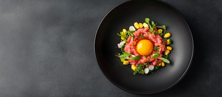 Raw beef tartare garnished with microgreens, black truffle, and quail egg yolk served on a black plate with scattered seasoning and herbs. Gourmet Raw Cuisine concept.