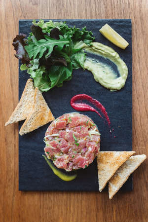 Top view of Spicy Bluefin Tuna Tartare with sour and spicy sauce. Served with toast and salad on black stone plate.