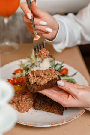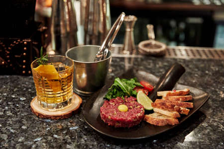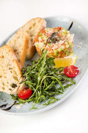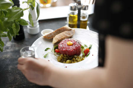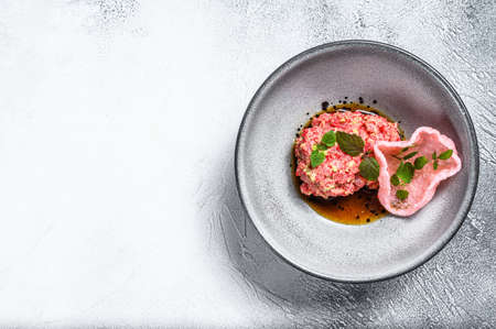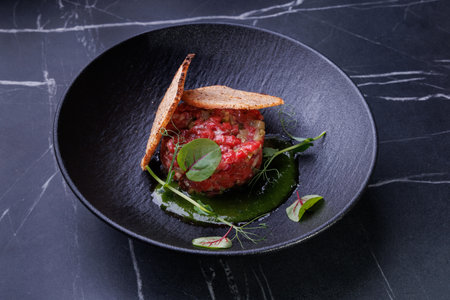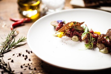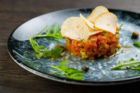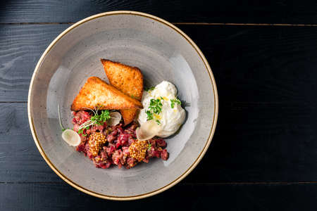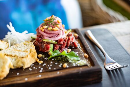 Beef tartare with crispy toast. The food in the restaurant. Food styling and restaurant meal serving.