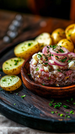 Focus on salted herring tartare with diced onions and black pepper, paired with boiled potatoes.