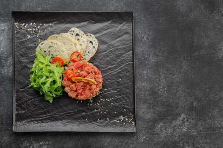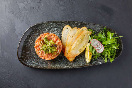 Salmon tartare with cucumber and bread toast. Black restaurant plate