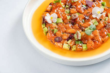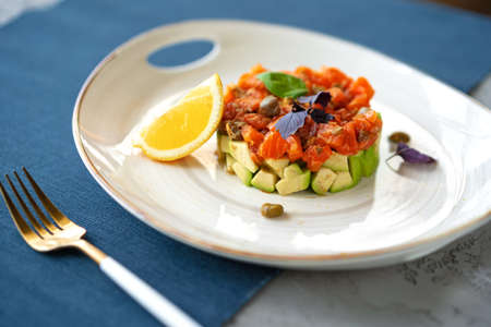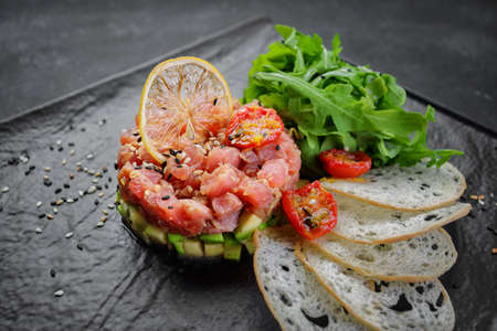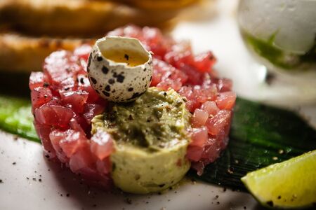 Gourmet fish tartar raw from tuna fillet with hashed avocado, selective focus