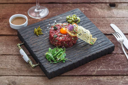 Beef tartare on wooden plate. Restaurant appetizer. Gourmet food