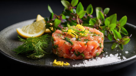 A beautifully arranged salmon tartare sits on a dark plate, garnished with fresh herbs, lemon wedges, and sea salt. The dish showcases vibrant colors and a modern presentation.