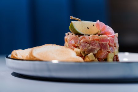salmon tartare with pepper and tomatoes. fish tartare with thin slices of white bread on a blue mnamoreny plate
