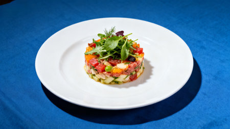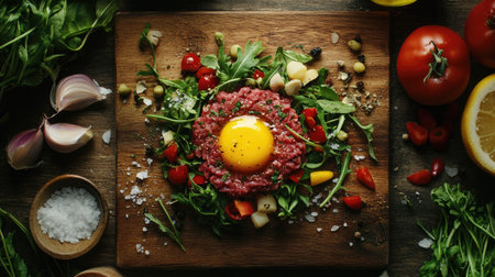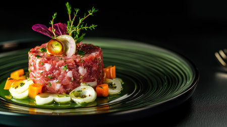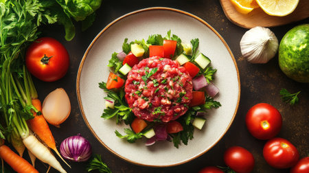 Fine dining beef tartare surrounded by artfully arranged vegetables on a plate, modern gourmet top view shot