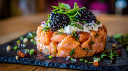 A beautiful salmon tartare topped with fresh blackberries and creamy dressing, elegantly presented on a slate plate. Perfect for gourmet dining experiences.