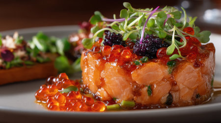 Discover a beautifully presented salmon tartare topped with bright microgreens and fish roe, perfect for gourmet dining and artistic culinary displays.