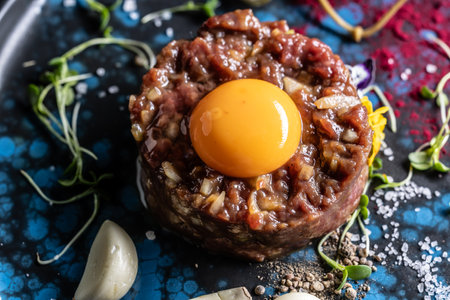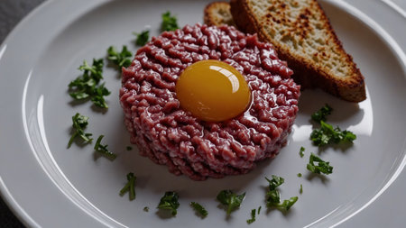 Gourmet beef tartare with raw egg yolk and herb on plate luxury appetizer with capers onions seasoned minced beef