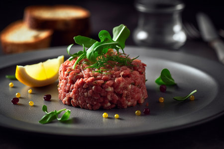 Beef tartar with lemon and herbs, greenery and spices, served on a black stone plate on restaurant table. French cuisine, classic beef steak tartare, ingredients: raw beef meat, salt, pepper, egg, garlic. AI generated image