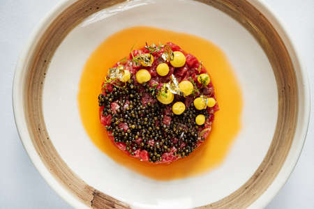 Tuna Tartar with Avocado on white plate, molecular Haute cuisine