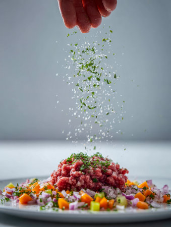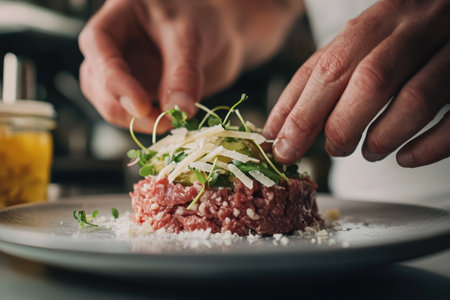 Detailed view of hands carefully adding greens and parmesan over beef tartar on a restaurant plate, shot in soft natural light. Gourmet Raw Cuisine concept. Culinary Craftsmanship concept.