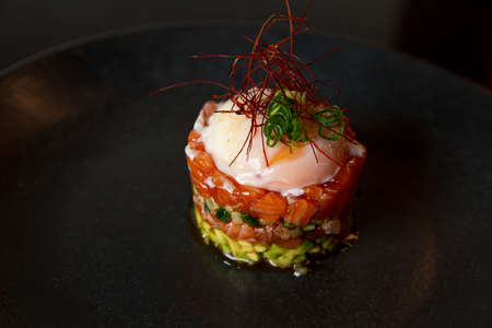 Salmon tartare with raw egg in the kaiseki fine dining Japanese restaurant, with a fine black plate in black scene background