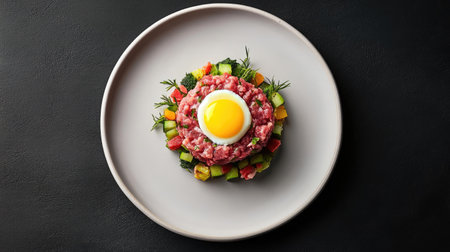 Classic beef tartare with egg yolk and tasty vegetables served on a minimalist plate, captured in top-down perspective