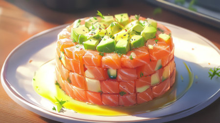 Raw salmon tartare Fresh salmon avocado and pesto sauce with red caviar on a plate Selective focus : Generative AI