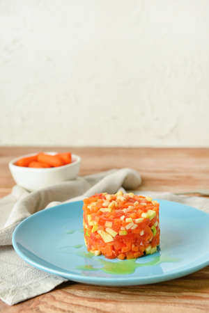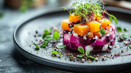 Vibrant gourmet vegetable tartare beautifully plated with bright orange cubes, purple layers, fresh microgreens, and seasoning on a dark plate.