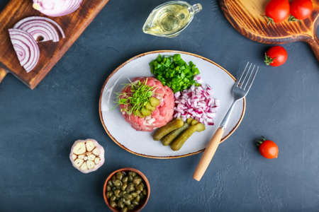 Flat lay of classic beef tartare with raw yolk and a mix of tasty vegetables, minimalistic fine dining concept