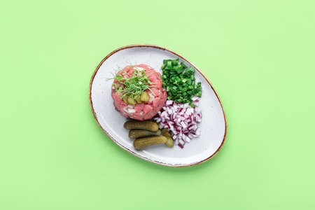 tasty Steak tartare (Raw beef) - classic steak tartare on white plate