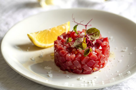 This exquisite beef tartare dish showcases quality ingredients and artistic presentation. Served with toasted bread, capers, and microgreens, it offers a balance of flavors and textures, perfect for a fine dining experience.