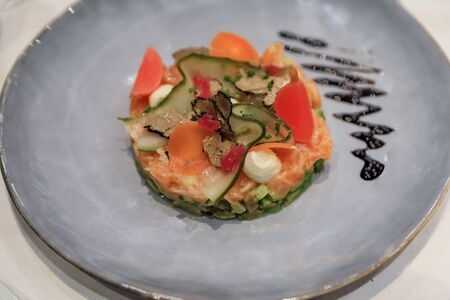 Salmon carpaccio appetizer with slices of a black truffle on a plate at a luxury restaurant in Nice, France