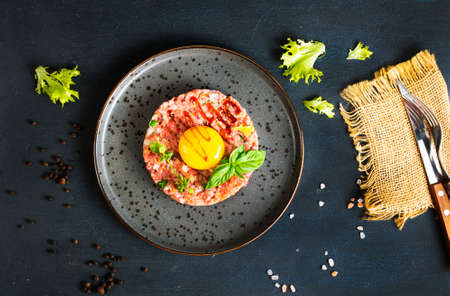 Chopped beef tenderloin, beef tartare with yolk. Appetizing appetizer. Suggestion to serve the dish. Culinary photography.