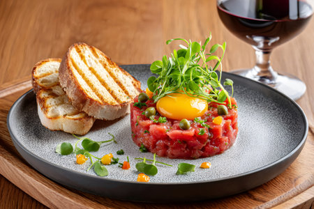 Gourmet tuna tartare with raw egg yolk, capers, microgreens and toasted bread, paired with a glass of red wine