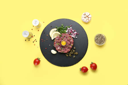 Composition with tasty beef tartare on color background